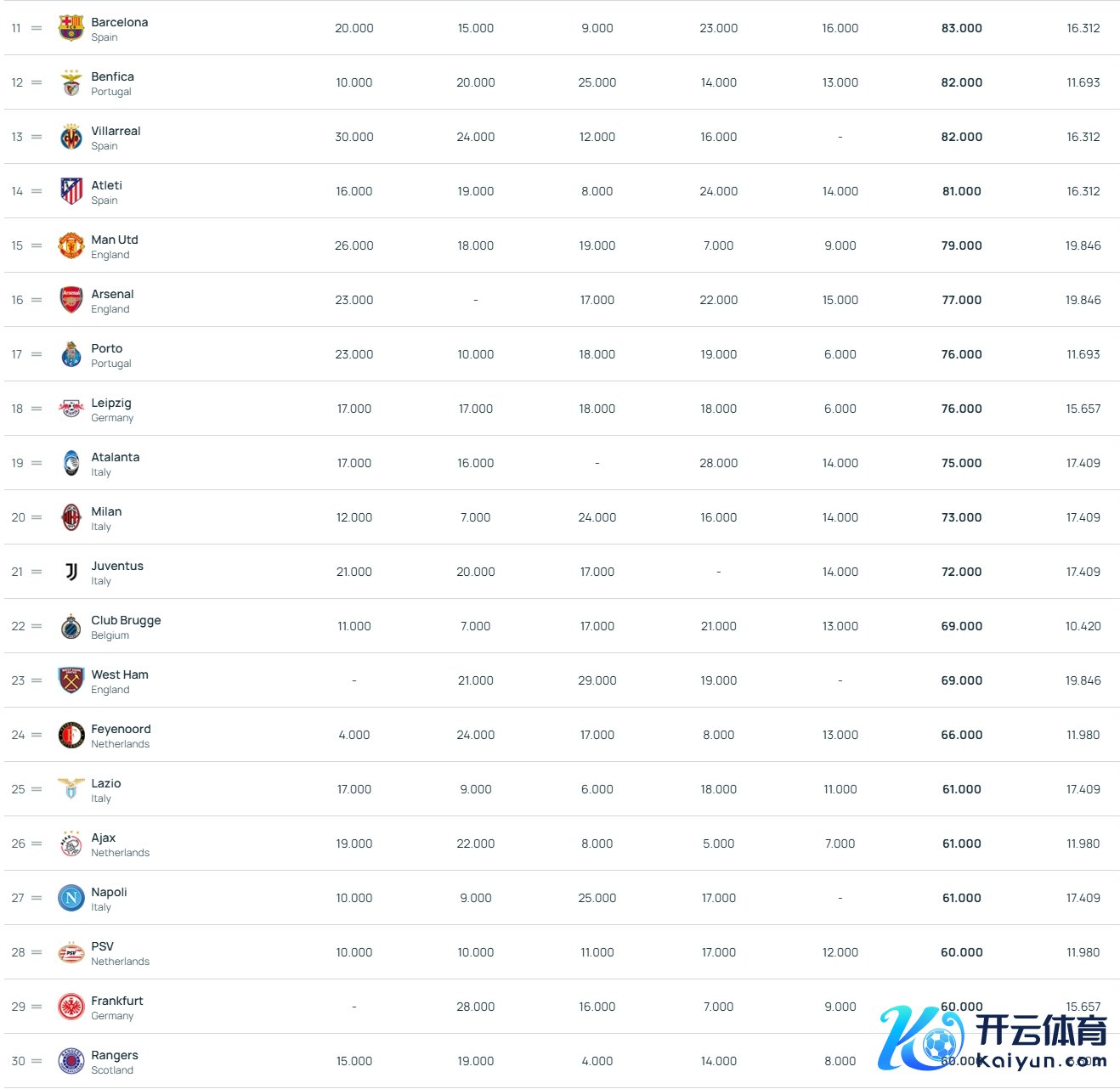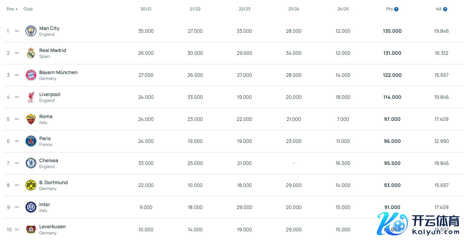 欧足联2024年终俱乐部扫数排行前十(近五年扫数):