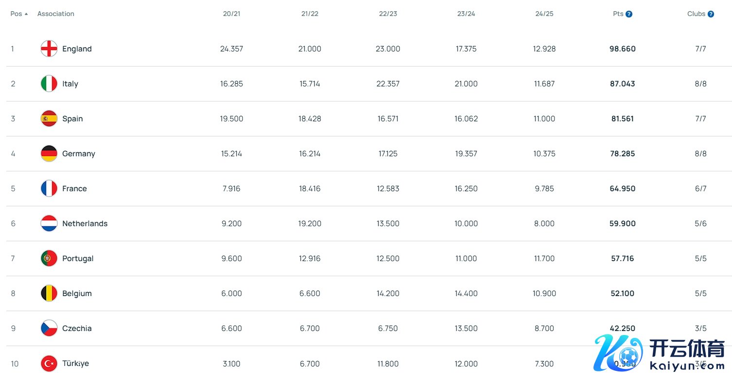 欧足联2024年终协会扫数排行(近五年扫数):